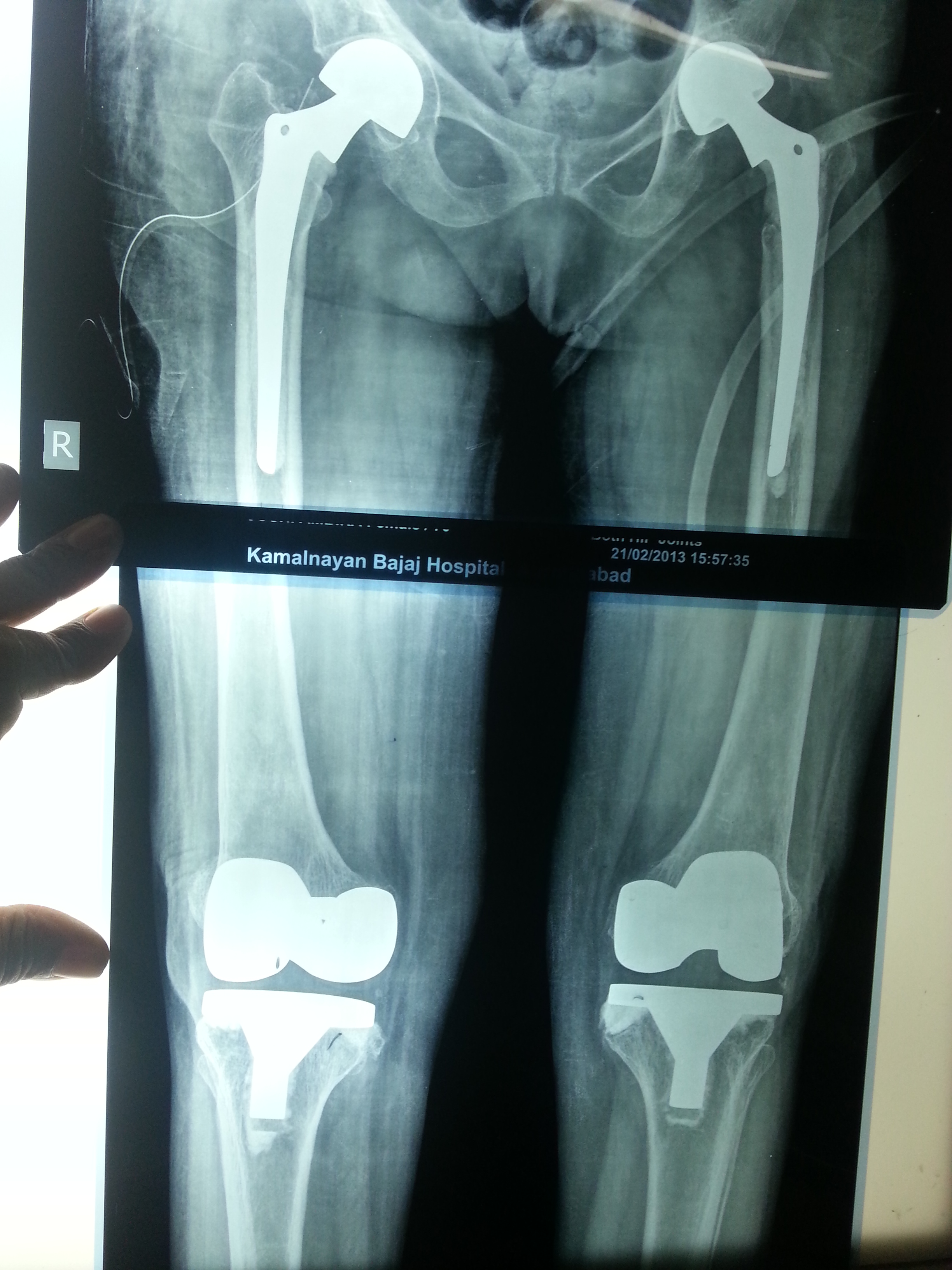 My own uncle. Right side rotating platform knee (Depuy ) done 5 yrs back. Left side all poly Oxinium knee ( Smith & n) done 6 months back.